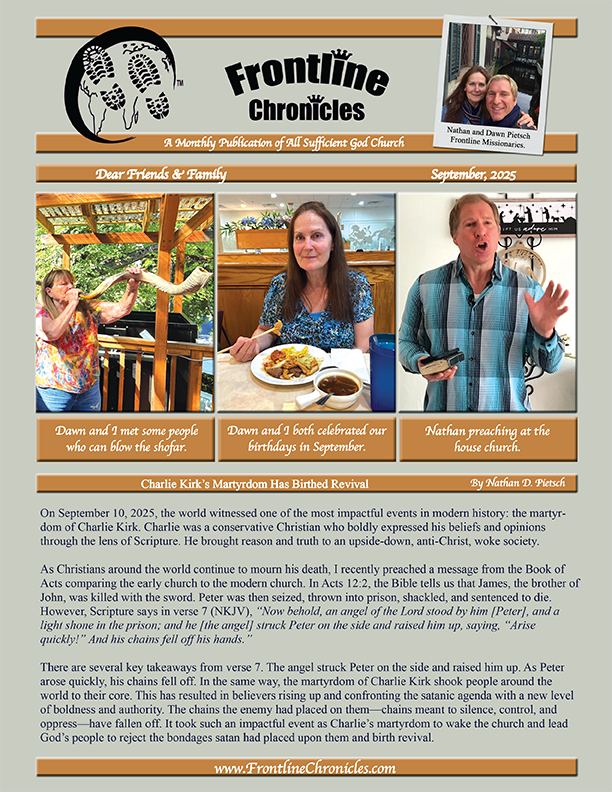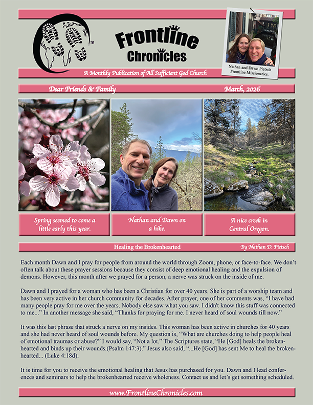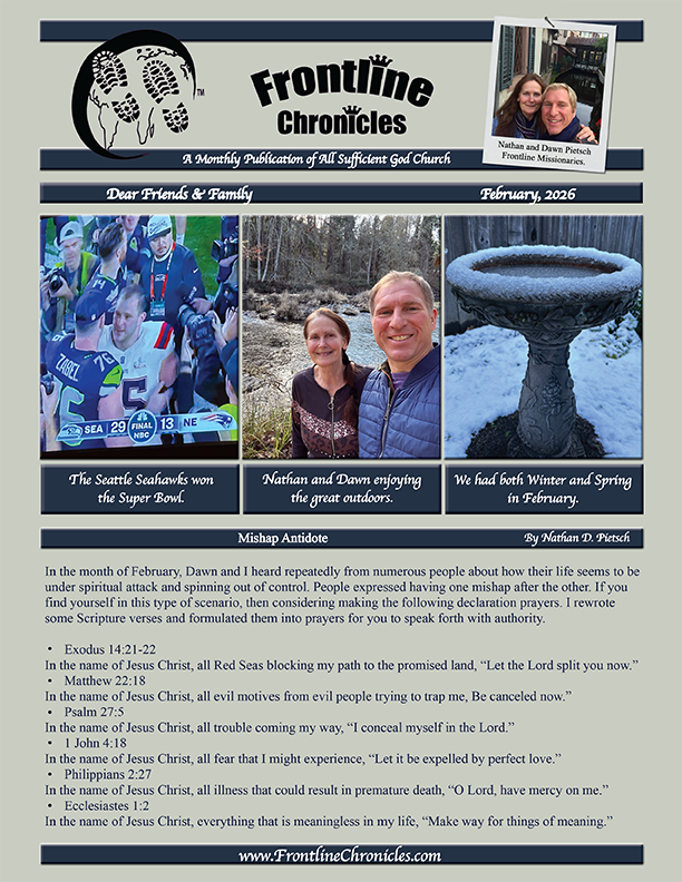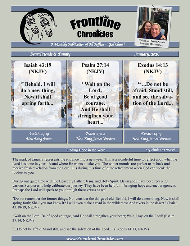 We want to welcome you to Frontline Chronicles, the monthly publication of All Sufficient God Church. This church was founded by Nathan and Dawn Pietsch, frontline missionaries. Every month All Sufficient God Church releases an update from the mission field on what God is doing through this ministry.